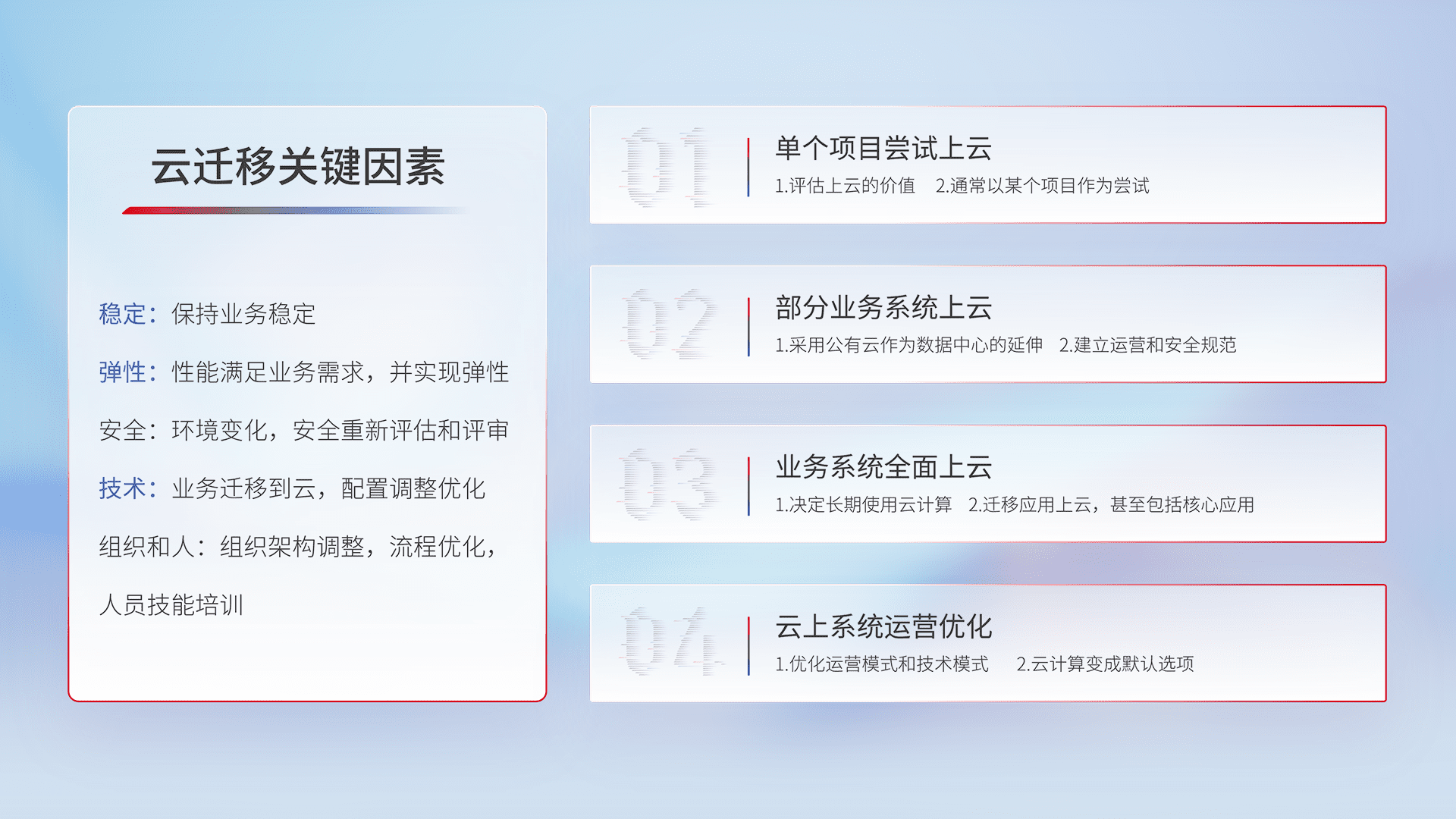 结合实际业务,,,,从规划设计、、、云平台选型、、、云原生改造、、、、数据迁移、、集成交付,,,迁移全过程为客户识别最佳上云路径,,,,做好风险识别管理,,,,设计网络架构、、身份权限、、、、安全审计合规、、、操作审计、、日志审计、、监控告警策略、、、多站点容灾设计等,,,对云上基础设施进行整体规划,,,提升IT治理水平,,以满足弹性、、、高可用、、高性能的需求。。。